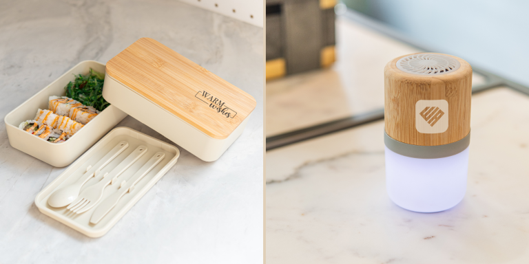 Wheat Straw – A byproduct of wheat production, which can be moulded into various shapes and sizes, allowing for a wide range of products, including utensils and containers. Renewable and environmentally friendly, this material offers a distinct texture and look, perfect for setting your products apart from the crowd. Check out this Wheat Straw Bento Box with a stackable design and a bamboo lid that can be engraved with your logo.